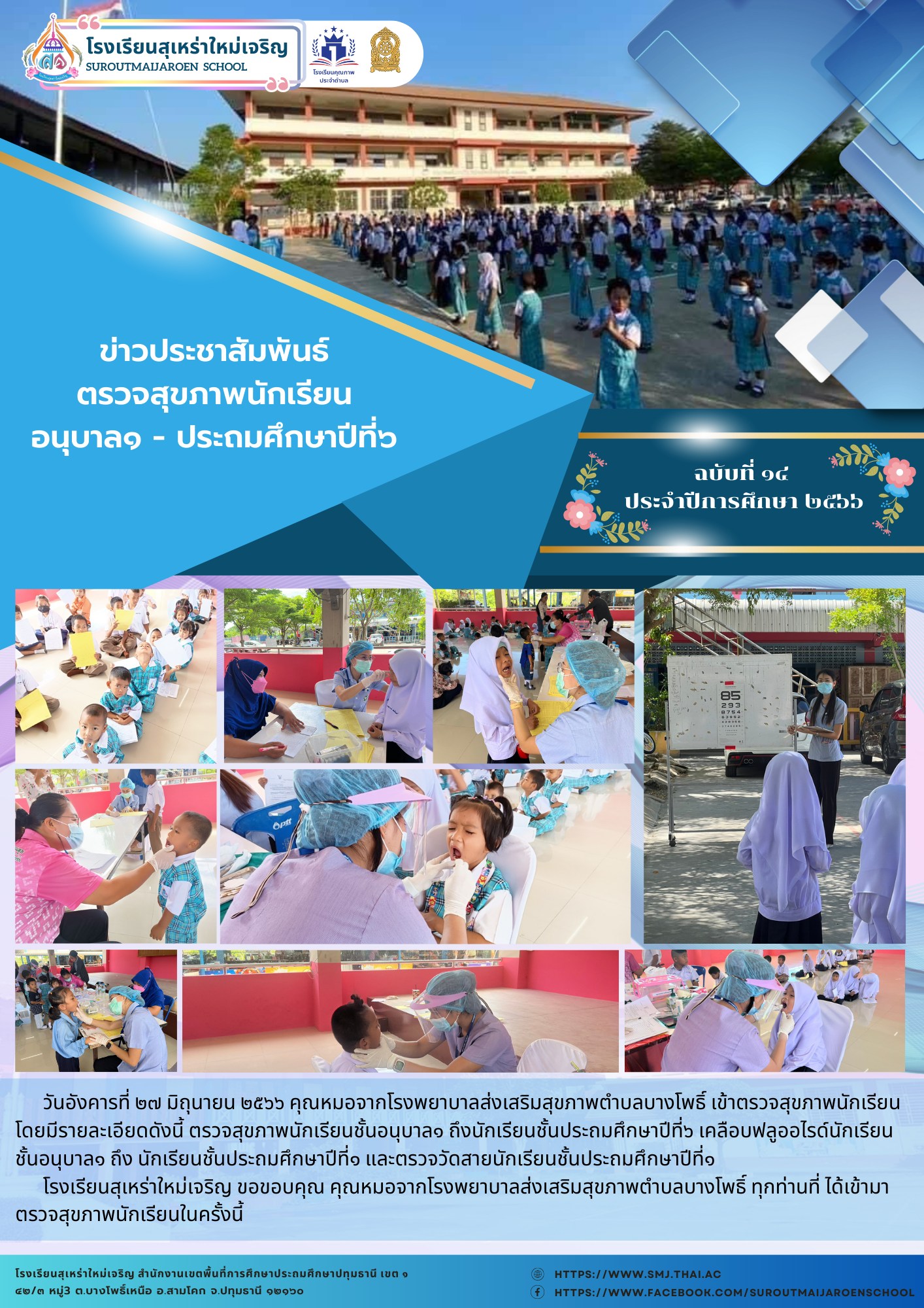 วันอังคารที่ ๒๗ มิถุนายน ๒๕๖๖ คุณหมอจากโรงพยาบาลส่งเสริมสุขภาพตำบลบางโพธิ์ เข้าตรวจสุขภาพนักเรียนโดยมีรายละเอียดดังนี้ ตรวจสุขภาพนักเรียนชั้นอนุบาล๑ ถึงนักเรียนชั้นประถมศึกษาปีที่๖ เคลือบฟลูออไรด์นักเรียน