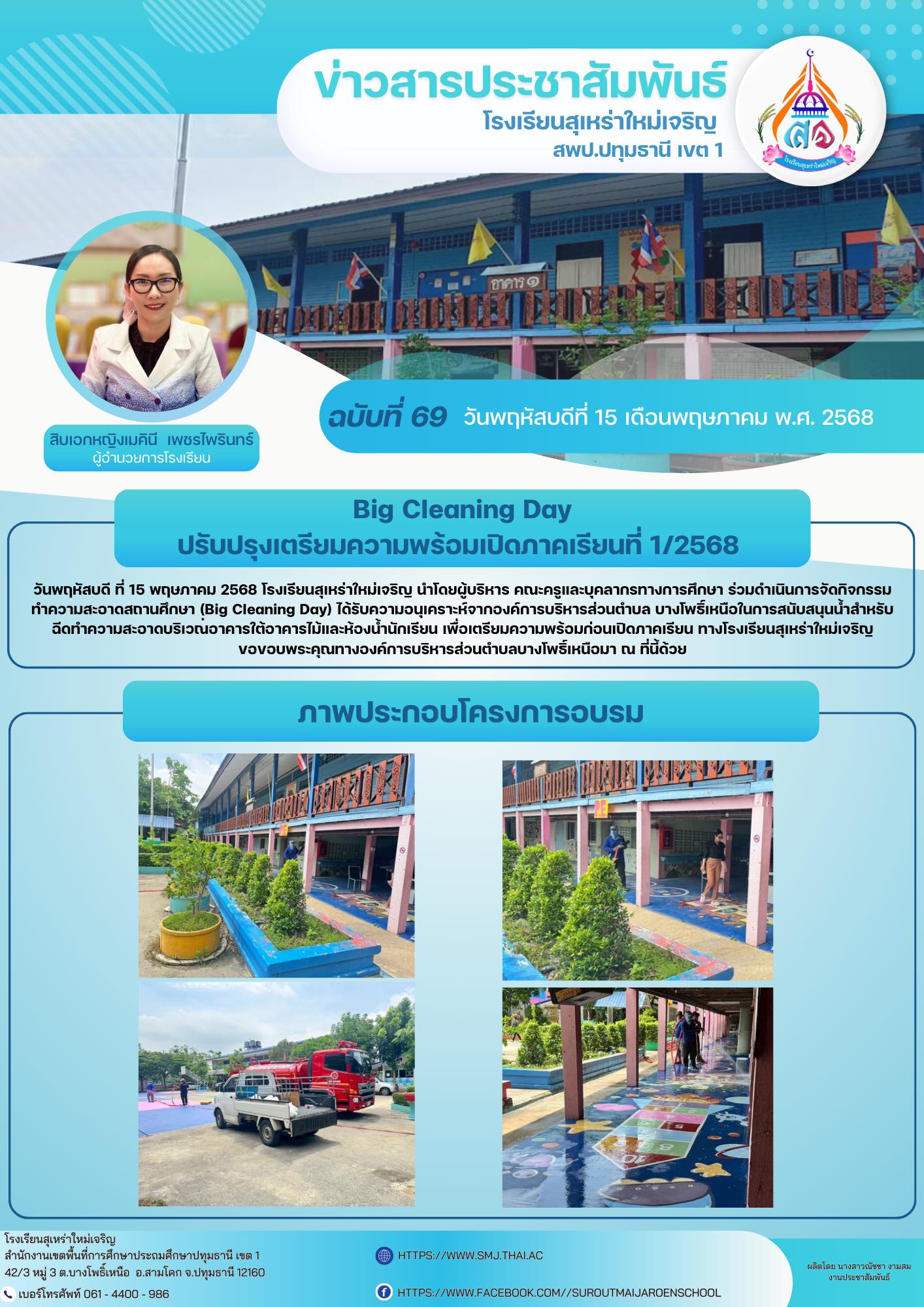 วันพฤหัสบดี ที่ 15 พฤษภาคม 2568 โรงเรียนสุเหร่าใหม่เจริญ นำโดยผู้บริหาร คณะครูและบุคลากรทางการศึกษา ร่วมดำเนินการจัดกิจกรรมทำความสะอาดสถานศึกษา (ฺBig Cleaning Day) ได้รับความอนุเคราะห์จากองค์การบริหารส่วนตำบล บางโพธิ์เหนือในการสนับสนุนน้ำสำหรับฉีดทำความสะอาดบริเวณอาคารใต้อาคารไม้และห้องน้ำนักเรียน เพื่อเตรียมความพร้อมก่อนเปิดภาคเรียน ทางโรงเรียนสุเหร่าใหม่เจริญ ขอขอบพระคุณทางองค์การบริหารส่วนตำบลบางโพธิ์เหนือมา ณ ที่นี้ด้วย